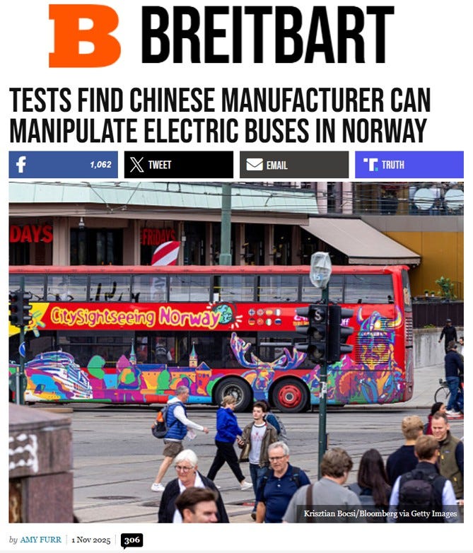 Number 2. Breitbart. Chinese electric bus manufacturer can manipulate buses in Norway.