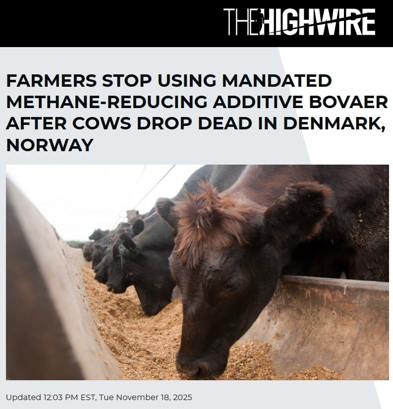 Number 1. The Highwire dot com. Cows drop dead from mandated methane-reducing treatments.