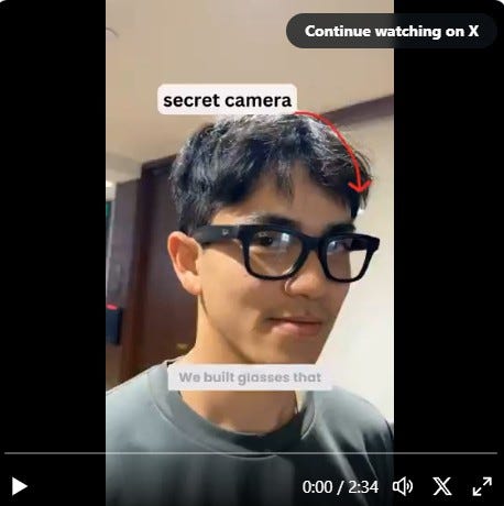 A man entered a New York City subway wearing his stylish new over-large horn-rimmed glasses. Created by Meta, they were camera-equipped. A tiny light on the front indicates they were filming strangers.