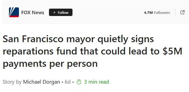 Number 2. Fox News. San Francisco establishes $5 million fund for slavery reparations.