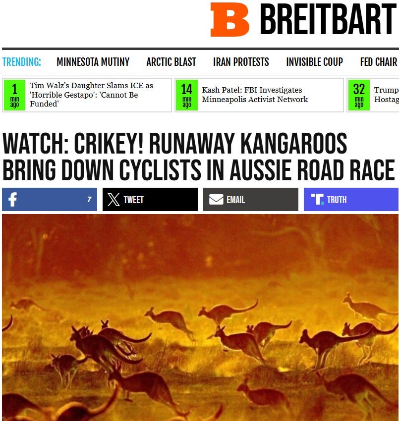 Number 2. Breitbart. Kangaroos attack cyclists during road race in Australia.
