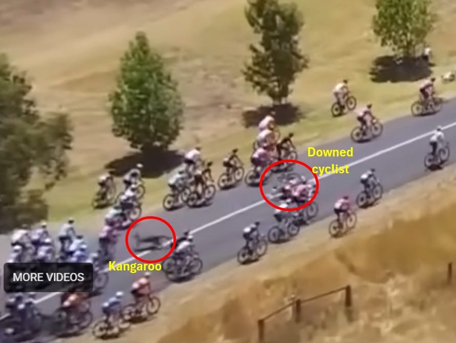 Video shows a kangaroo charging across a paved highway and taking down the race leader, leaving him to recover from road rash and a bent bicycle while other contestants rush past him.