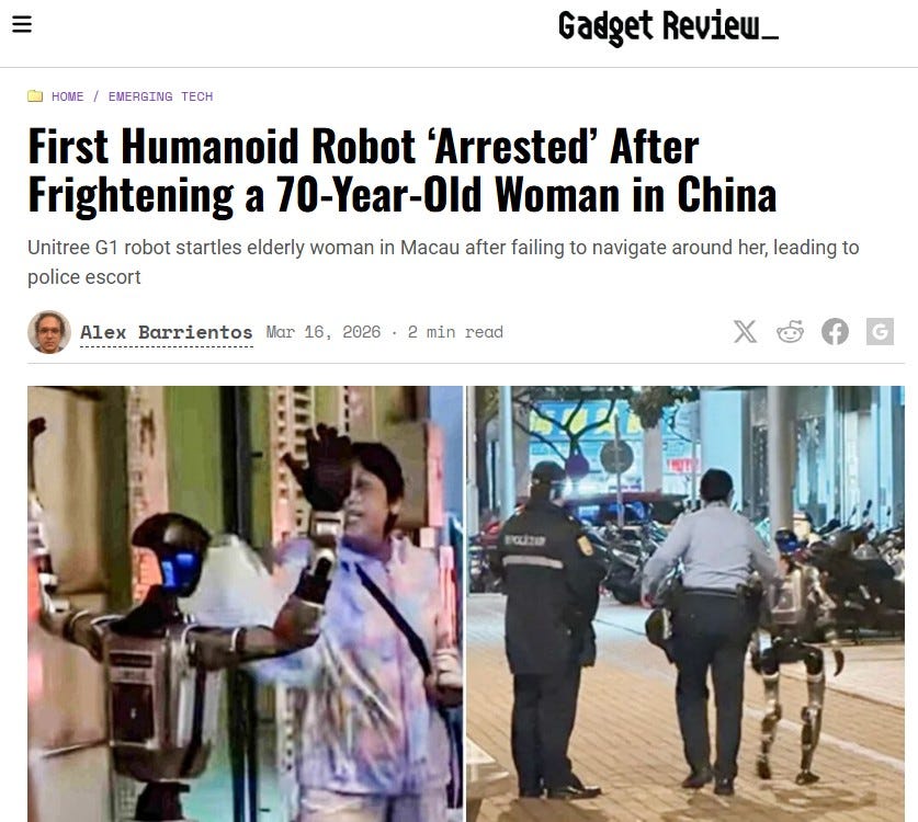 In a technology first, but probably only the first of many, a four-foot-tall robot was arrested in Macau last week for harassing a woman on a residential sidewalk. It is not clear whether words were actually exchanged, or if the victim, a woman in her seventies, simply laid down the law for the AI-powered machine.