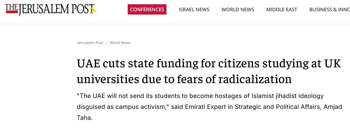Citing concerns about its students becoming radicalized by Islamic jihadism, the United Arab Emirates will no longer subsidize study in the UK. They have identified more than a dozen colleges and universities in England and Ireland that have been cut off from UAE state funding.