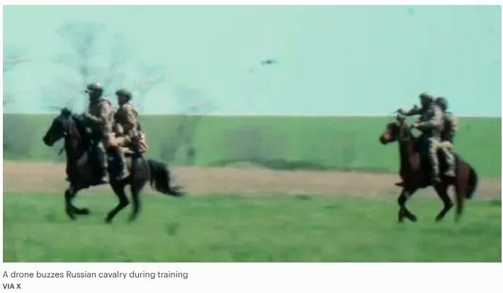 Speaking of Ukrainian attack drones: Horses don’t seem to like them. There is video of dismounted Russian soldiers who draw the attention of exploding drones. The horses flee, the soldiers go down. Happily, while the horses are no doubt terrified, they at least are still in one piece.