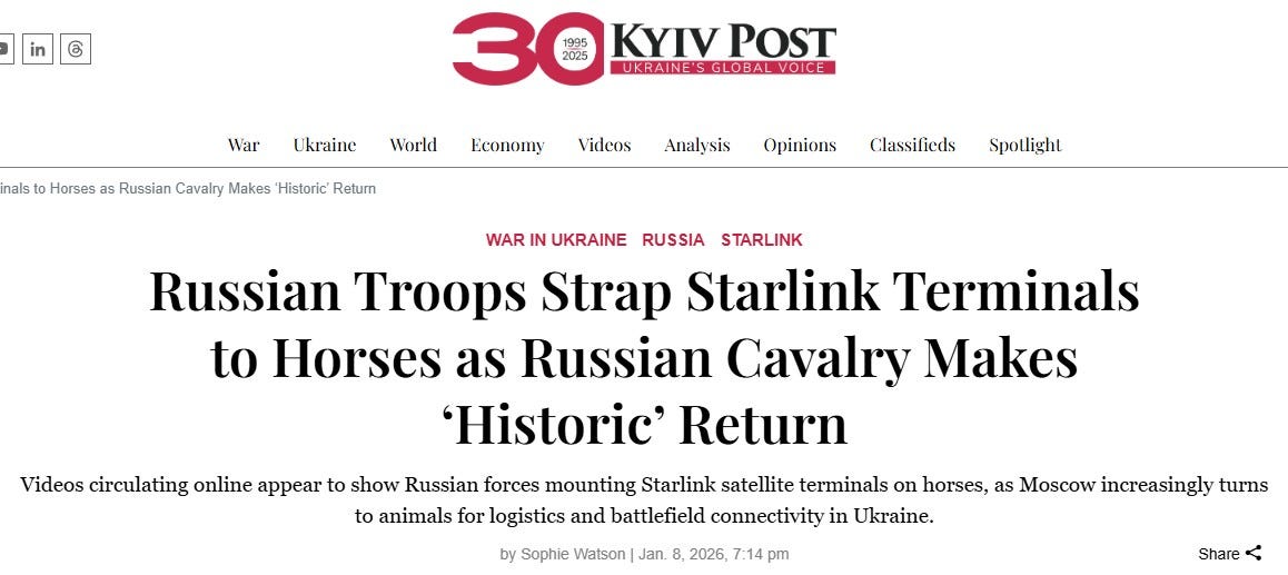 No, the use of horses is a sign of tactical brilliance, according to reliably official Moscow news reports. Special saddles can easily be adapted to accommodate Starlink transceivers, enabling Army field units to rip off Elon Musk for secure communications through third-party arrangements, despite being denied direct service during their Ukraine invasion.