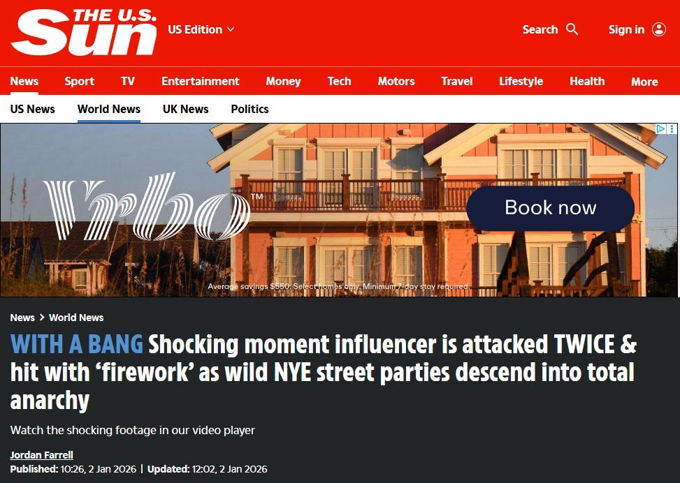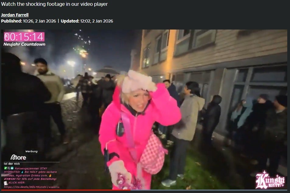 Speaking of fireworks lighting up New Year’s Eve, an internet influencer named Kunshikitty, with 200,000 followers, stepped into a street celebration in Cologne with a quarter million other revelers to welcome 2026.