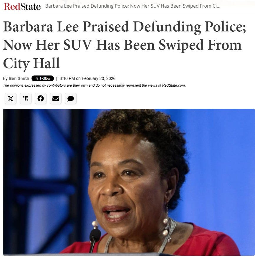 Number 1. Redstate. Oakland mayor moves to defund the police; then her SUV is stolen from City Hall.