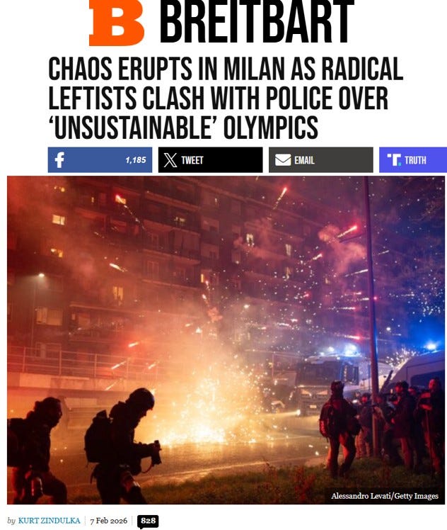 Multiple unspecified leftist groups have protested the Olympics for multiple unspecified reasons. Some 5,000 protesters turned out in Milan last week. For some, It had to do with all the wood used to build the bobsled track because the deforestation required was unsustainable.